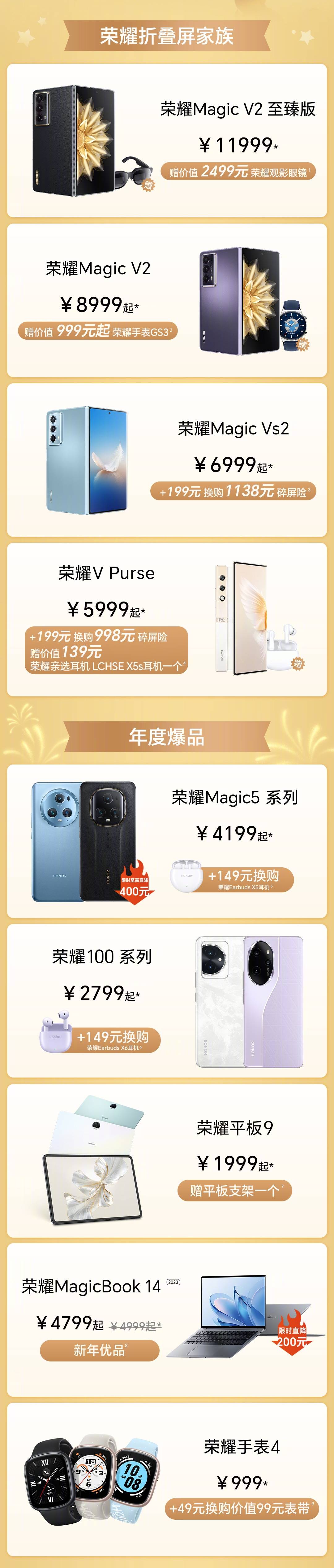 即日起至2024年1月17日期间,消费者前往全国荣耀授权体验店购买包括荣耀Magic V2 至臻版、荣耀Magic V2、荣耀Magic Vs2、荣耀V Purse在内的折叠屏系列产品均可享福利活动,5999元起即可入手荣耀轻薄折叠屏,还有荣耀观影眼镜、荣耀手表GS3等好礼搭赠;活动同步覆盖手机、笔记本电脑、平板等荣耀年度爆款人气产品,详情可咨询当地门店或登陆荣耀商城及各大授权电商查看。