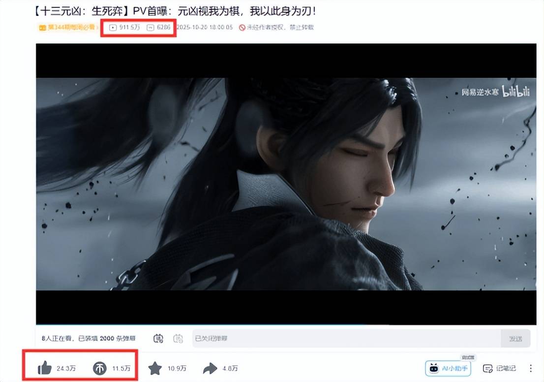 截止到目前为止,这支名为“十三元凶:生死弈”的PV已经获得了911.5万的播放和24.3万的点赞,还一度刷新了同类游戏的内容传播记录,登上了B站播放量第一的宝座,其爆发出的能量可谓磅礴。