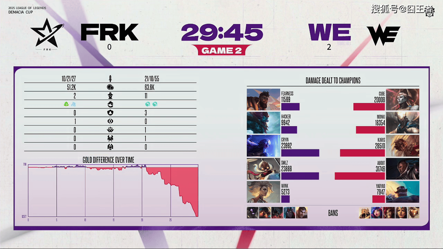 结果第二局比赛,WE打成了单方面的碾压局。6分钟左右,WE在下路打出2换2;13分钟左右,芮尔在野区被击杀;14分钟左右,卢锡安在中路被击杀;20分钟左右,布隆先行被秒,后续WE打出反打打出3换5;23分钟左右,WE拿下厄塔汗,后续打出1换3;26分钟左右,WE率先开团,打出0换4,随后拿下大龙;最终29分45秒,WE团灭FRK,然后顺利一波