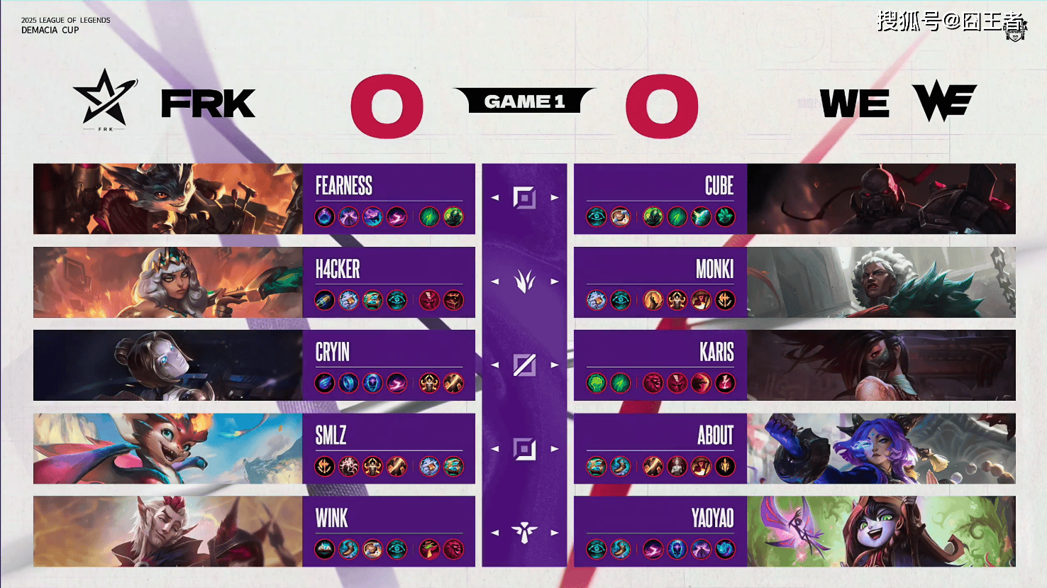 第一局比赛,FRK蓝色方,禁用:杰斯、维鲁斯、剑魔、泰坦、芮尔,选用:fearness兰博、H4cher奇亚娜、CRYIN发条、SMLZ小火龙、Wink洛;WE红色方,禁用:波比、沙皇、妮蔻、牛头、列娜塔,选用:Cube塞恩、Monki狼母、Karis阿卡丽、About芸阿娜、Yaoyao露露