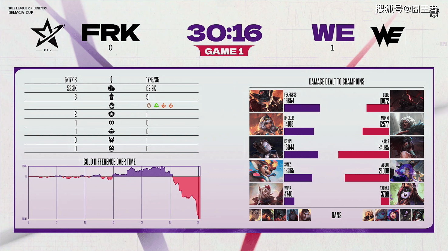 结果第一局比赛,两队各打了半场好局,WE笑到了最后。12分钟左右,WE在野区击杀洛;17分钟左右,FRK找到机会击杀WE下路双人组;19分钟左右,WE在下路击杀兰博,WE拿下小龙;23分钟左右,阿卡丽单切小火龙,后续FRK抢下厄塔汗,后续WE打出1换4;26分钟左右,WE在中路打出0换3,随后拿下大龙;最终30分16秒,WE团灭FRK后,顺利一波