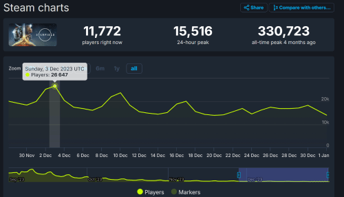 根据SteamDB数据显示,Steam平台《星空》的24小时最高在线人数为15516人,在2023年12月初,游戏的最高在线人数约为2.6万,而在过去4个月,游戏的最高在线人数为330723人。