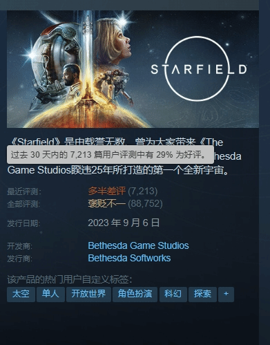 贝塞斯达的科幻RPG大作《星空》在Steam商店 的三十天评价已经跌至多半差评。7213条评测中,好评率仅仅有29%。