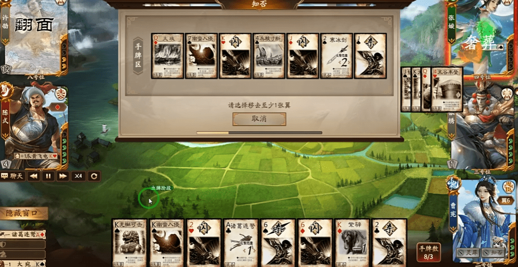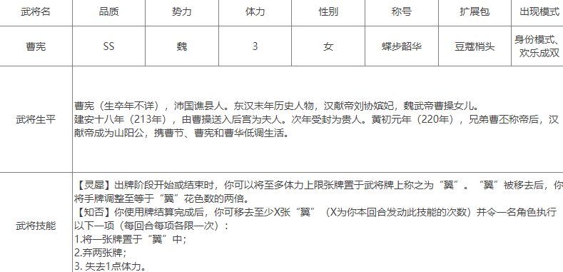 曹宪是3血2技能魏将,【灵犀】出牌阶段开始或结束时,你可以将至多体力上限张牌置于武将牌上称之为“翼”。“翼”被移去后,你将手牌调整至等于“翼”花色数的两倍。 【知否】你使用牌结算完成后,你可移去至少X张“翼”(X为你本回合发动此技能的次数)并令一名角色执行以下一项(每回合每项各限一次): 1.将一张牌置于“翼”中; 2.弃两张牌; 3. 失去1点体力。