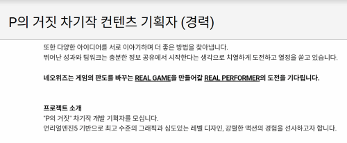 近日,去年大火的类魂游戏《匹诺曹的谎言》开发商Neowiz更新了官网的招聘信息,而招聘信息显示,他们正在开发一款名叫“P’s Lie Next”的游戏,应该就是《匹诺曹的谎言》的续作。