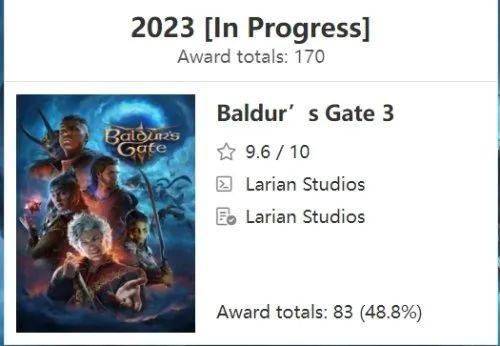 根据数据统计网站GOTY gamefa的最新数据显示,迄今为止,《博德之门3》已经拿到了83项年度最佳奖,而总奖项数目前为170。