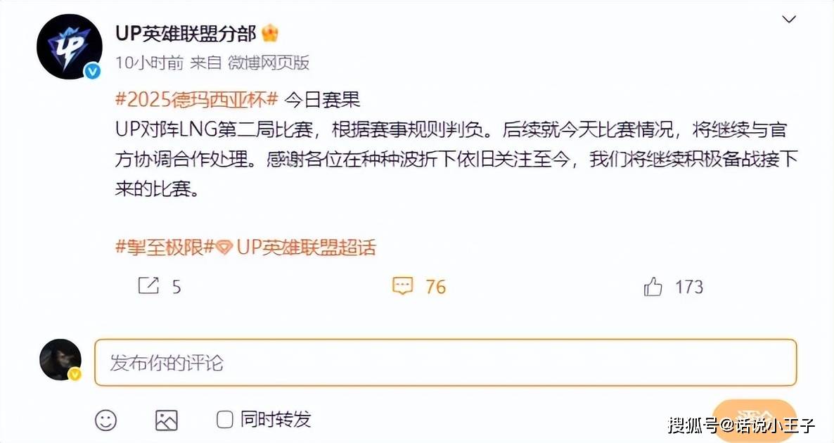 到了第2场比赛,UP同样因为网络不稳定导致比赛就推迟了一个多小时。等待了一个多小时后,又因为超时没能进入状态,按照比赛规则被判负两分。需要注意的是,虎牙居然还删除了赛事结果,但是根据官方发布的赛事结果,LNG确实是赢下了UP,应该是不会进行重赛了。只是UP真的是太倒霉了,因为他们后台网络监测是没有异常的,除了比赛服,其他全都是正常的。但是最终结果却说他们因为自身原因直接被判负,估计UP的选手都要难受死了。