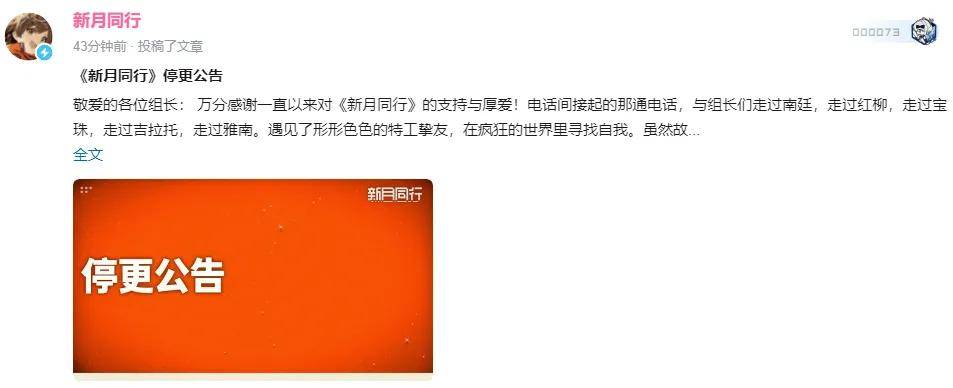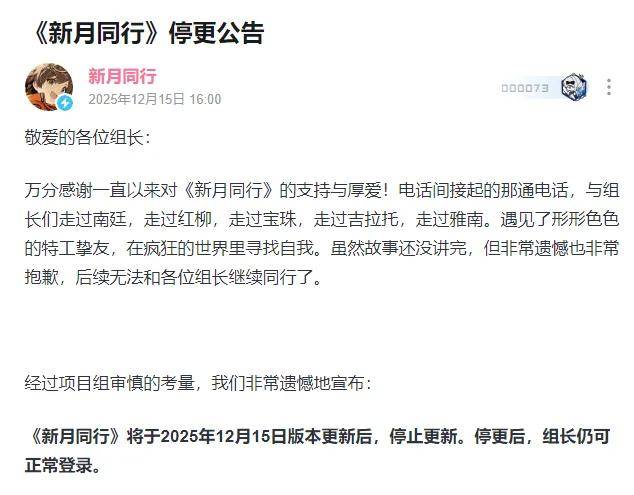 2025年12月15日下午4时,《新月同行》在各大平台官号发布了“停更公告”,表示《新月同行》将于2025年12月15日版本更新后,停止更新。