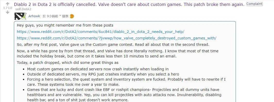 尤其Valve只在刚出编辑器和游廊时,很短一段时间内对其表示过一定支持态度,后面基本上就属于放养态度,并不关心制作者的意见,也不会提供实际的官方支持。同时每次《DOTA2》更新时的bug或者问题也会一并影响到RPG地图中去,许多RPG制作人需要额外花费更多时间去排查Valve更新带来的bug,制作者也多次向Valve提出修改意见,但V社并没有回应。