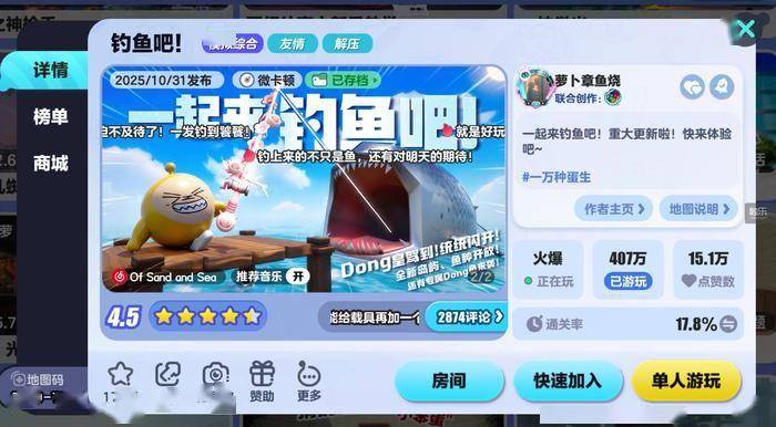 比如,我曾经接触过另一位地图作者“裤带梓大大”(他刚好也在不久前和柑子合作了一张新地图),他对我分享过自己在地图选材上的考虑,这都需要结合数据和当下流行的玩法趋势,他出于这些感受明确了自己擅长、也能获得更多收益的地图类型;再比如,同样组建了工作室的创作者“萝卜章鱼烧”,近期有一张十分热门的地图《钓鱼吧!》,里面的付费点设计完全发挥了《蛋仔派对》——这个非常擅长IP联动、有着海量联动素材的游戏——的优势,收获了超过400万的游玩量。