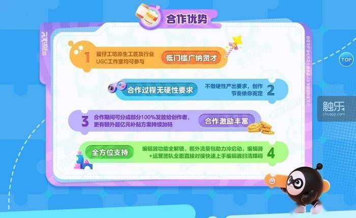 也是在前段时间,《蛋仔派对》在工坊活动界面发布了“乐园工作室”的合作招募令。这一招募令既针对有志组建工作室的蛋仔个人作者,也面向业内成熟的UGC工作室。官方将以工作室为单位提供全方位的支持,包括编辑器功能权限的开放、额外的亿元补贴和流量,最高100%分成乃至专业团队的指导。对于《蛋仔派对》来说,这无疑是它在“专业性”道路上的更向前一步。