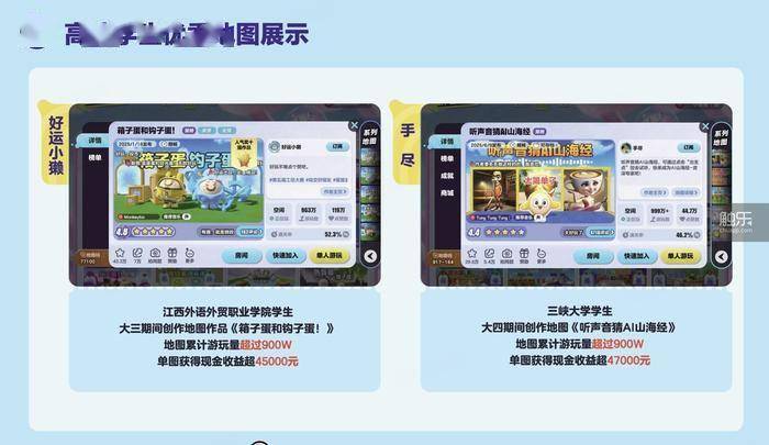柑子告诉我,现在《蛋仔派对》的创作者环境整体呈现一种“门槛低、上限高”的状态,新作者入门容易、激励措施友好,还有以老带新为主要模式的“高校匠星创造营”之类的体系——官方会面向合作的高校引入UGC课程,采用项目组员工和创作者的“双导师”制度,进行从0到1的集训。“我就是以导师的身份加入的,和学员们沟通时,也会产生很多新的想法和灵感。”