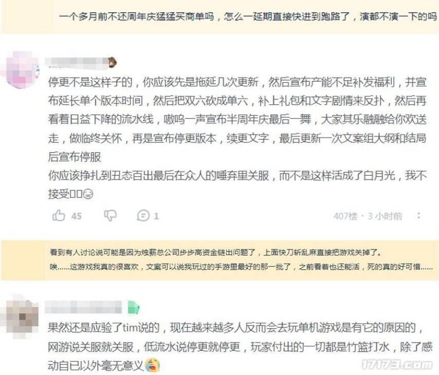 对于游戏的停运,因为这次停更来得太突然了,有网友调侃,一个月前的周年庆还疯狂买买买,一下就快进到跑路了,演都不演一下。
