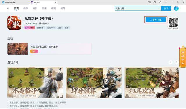 方法一:启动MuMu模拟器,在桌面的游戏中心搜索“九牧之野”,点击官方下载。
