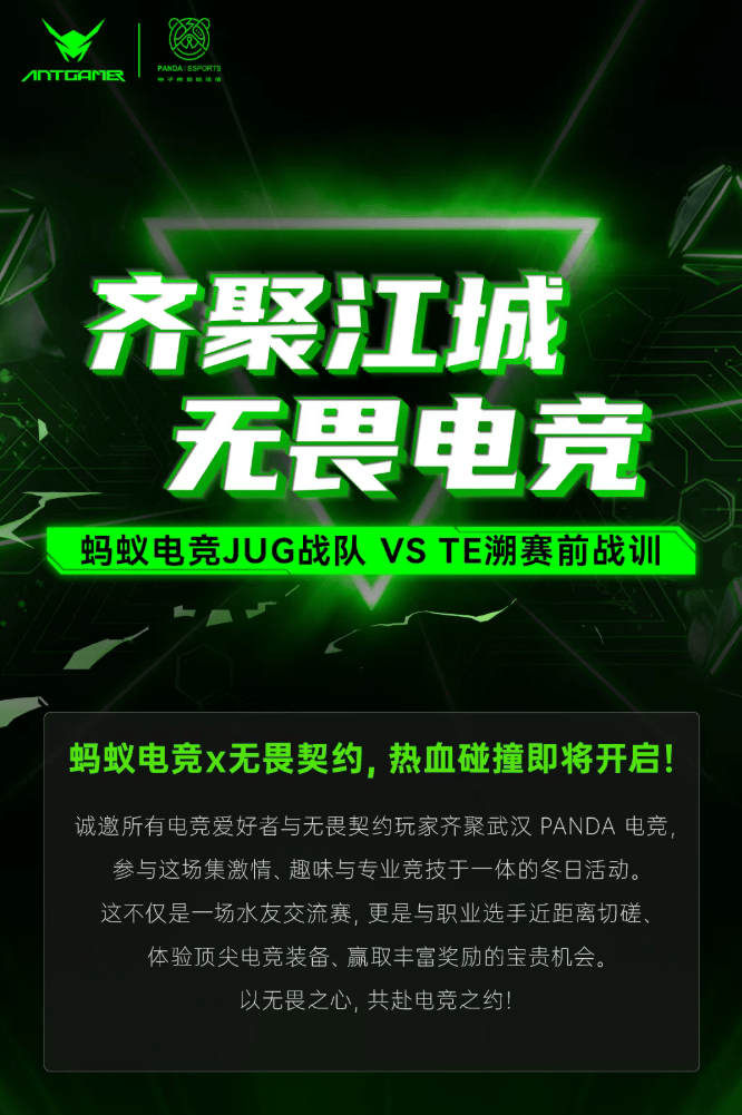 从TGA无畏契约ANTGAMER全国挑战赛打通“草根→全国赛”的晋级通道,到落地武汉的“职业战队+普通玩家”互动活动,蚂蚁电竞正在把“全民电竞”的理念从赛场延伸到线下场景。正如活动标语所言:“以无畏之心,共赴电竞之约”——这场在武汉的冬日狂欢,不仅是一次水友聚会,更是让“每个热爱电竞的人都能站上赛场”的实践:无论是想证明自己的操作,还是想近距离接触职业选手,都能在这里找到属于自己的“电竞时刻”。