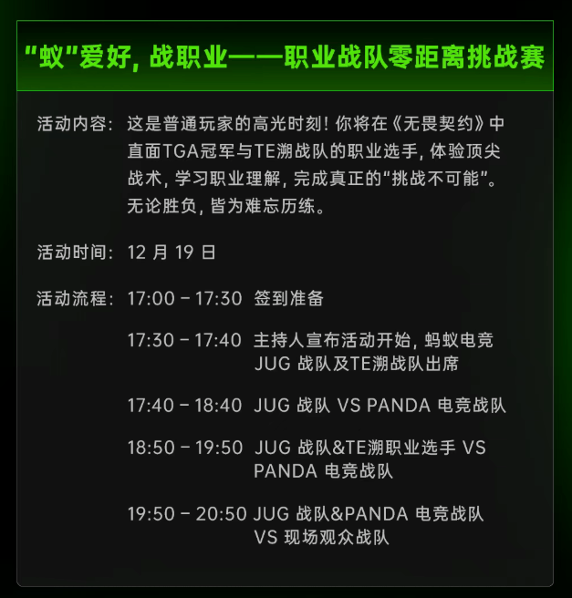 “蚁”爱好,战职业——职业战队零距离挑战赛(12.19):17:00起,活动将按流程开启:签到准备后,JUG战队与TE溯战队将率先亮相,随后依次展开“JUG vs PANDA电竞战队”“TE溯职业选手+JUG vs PANDA电竞战队”“JUG+PANDA战队 vs 现场观众战队”三场对抗,全程开放观赛,让玩家沉浸式感受职业赛事的氛围。
