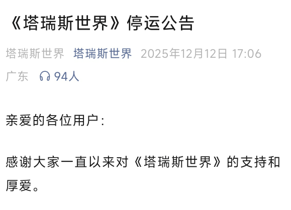 目前,《新月同行》和《塔瑞斯世界》已经都停止了注册,没想到在2025年最后这一个月,两款曾经在游戏圈引发不小讨论的游戏也寄掉了,也不知接下来还有没有高手退赛呢?
