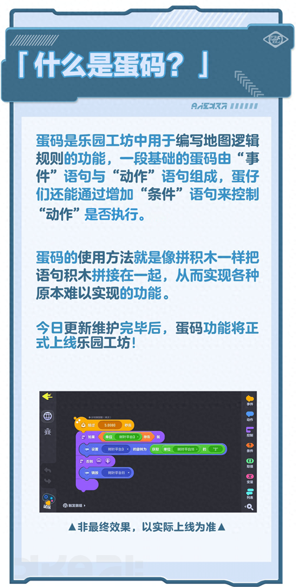 “蛋码”作为一项将游戏研发全要素嵌入UGC工具的功能,以极低的操作门槛面向所有用户。用户只需要按照规则编撰一段描述性文字,借助“蛋码”就能达成更复杂的场景或角色设计。比如以“进入某个区域”为“事件”,并添加“传送门”为“条件”,配合触发“召唤生物蛋仔”的“动作”,就能完成一套连贯的创作场景。