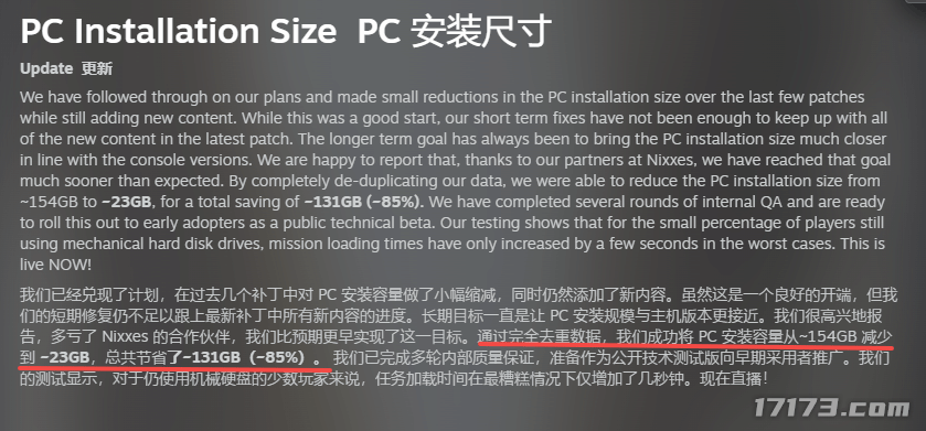 12月2日,开发商Arrowhead Game Studios宣布,通过移除原本为机械硬盘设计的冗余数据复制机制,并在索尼Nixxes Software协助下完成对底层代码的优化,《绝地潜兵2》PC版的安装体积已从154GB大幅缩减至仅23GB,一举释放131GB空间。