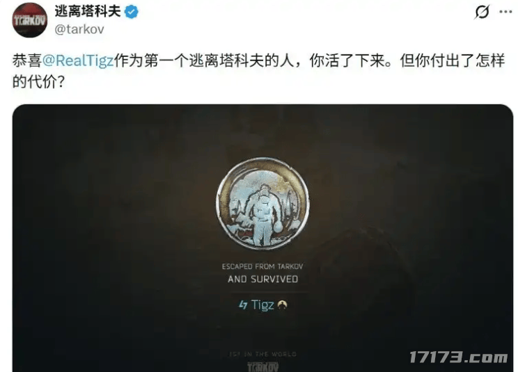 这一历史性时刻吸引了大量观众围观,连《逃离塔科夫》开发商Battlestate Games负责人尼基塔·布亚诺夫也全程观看直播,并在Tigz登船后发来祝贺: