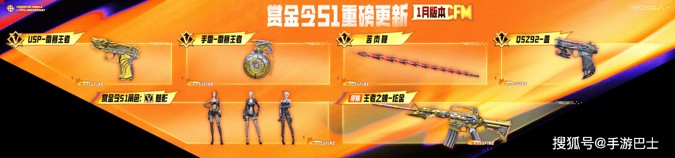 1月份,我们新的S1赏金令更新,不仅有雷暴王者系列的新品USP-雷暴王者和手雷-雷暴王者,同时大家期待的盖套装也来了,QSZ92-盖和苦肉鞭将助力喜欢盖的玩家们征战沙场。除此以外我们的老朋友炫金皮肤系列王者之魄-炫金也将登场,当然了本次我们也为大家准备了新的赏金令角色-魅影,也是一个CF经典IP角色,希望大家能够喜欢。