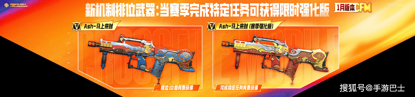 1月份,我们将更新新的排位赛武器ASH-马上来财,也是呼应了我们马年设计,在这里提前给大家拜个早年,同时呢这次我们不再是觉醒机制,而是进化机制,完成赛季任务,获得强力的赛季强化版,为大家带来新的体验!