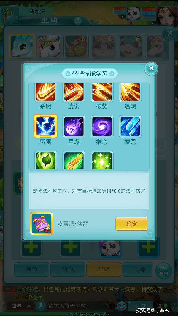 再如“落雷”技能,可让法宠攻击时,对首要目标额外增加(等级×0.6)的法术伤害。少侠可以培养多只坐骑,并搭配学习不同的驭兽诀技能,再针对性地统御对应类型的宠物,从而将驭兽诀的价值发挥到极致。