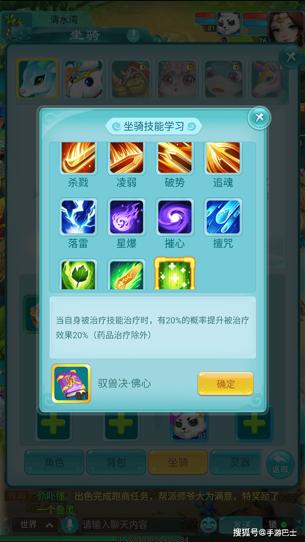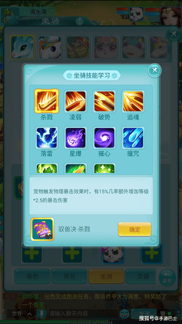 打开坐骑界面,左下角设有两个坐骑技能槽位,这正是驭兽诀发挥作用的地方。当坐骑学习了驭兽诀技能后,所有由它统御的宠物都将获得该技能的强力加成。