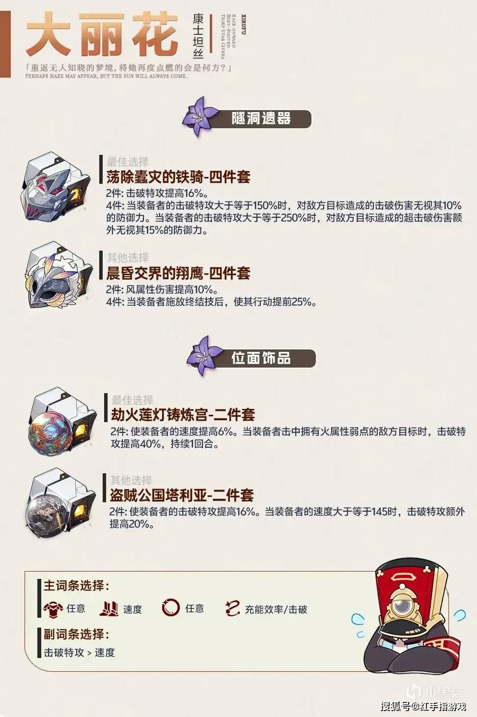 大丽花:提供击破前出伤的机制与击破特攻,防御降低,击破效率,速度提升和少量超击破倍率的属性加成;