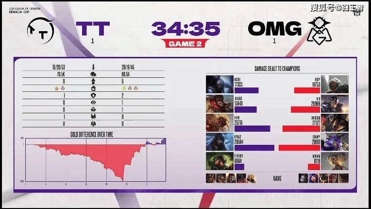结果第二局比赛,又轮到TT上演绝世翻盘局。前25分钟,OMG最高领先7000多的经济,但是最后,他们却浪了,给了TT翻盘的机会。24分钟左右,OMG在下路再次送掉,被TT打出0换5;26分钟左右,OMG在中路被打出1换4;28分钟左右,TT推掉下路高地;29分钟左右,TT打出2换3;最终34分35秒,TT拿下大龙,后续打出1换4,随后顺利一波