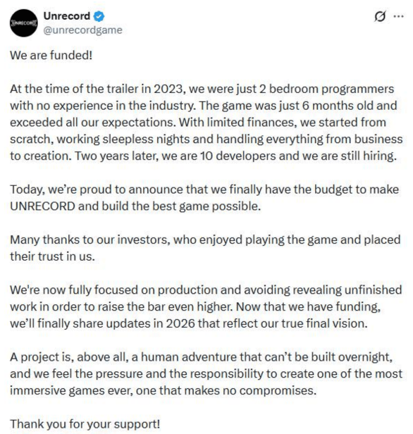 然而,由于团队规模较小、资源有限,《Unrecord》的开发进度一度缓慢,逐渐淡出公众视野。工作室创始人Theo Hiribarne表示:“自预告片发布以来,我们一直在努力完善游戏,力求不辜负玩家的期待。”