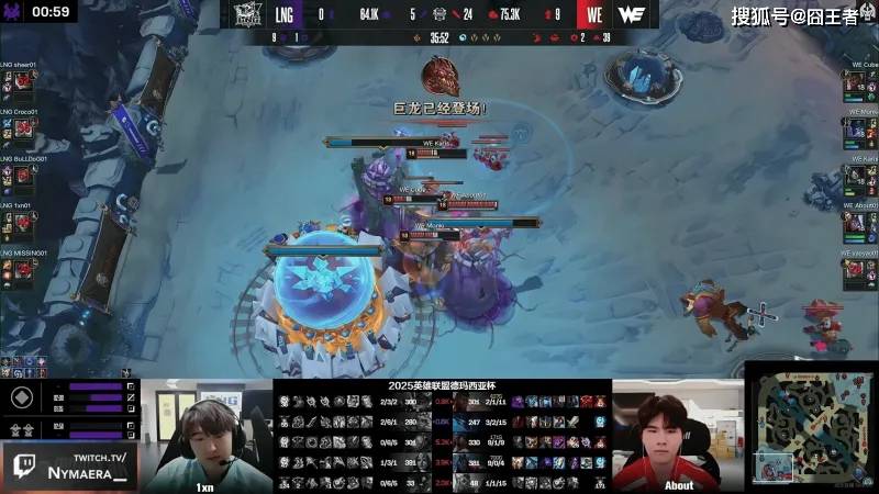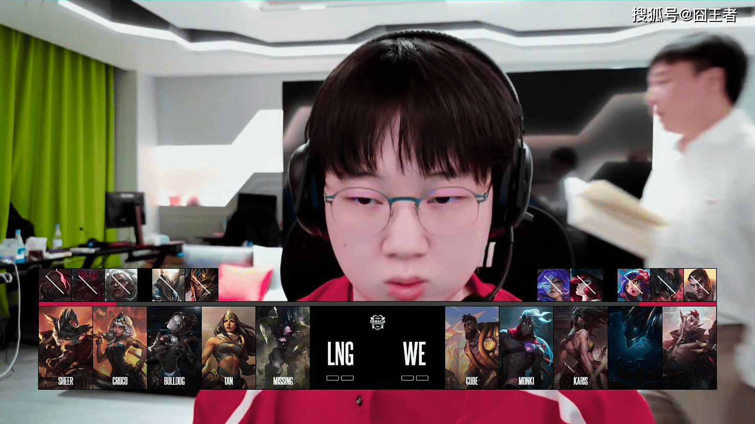 第三局比赛,WE蓝色方,选用:Cube塞恩、Monki杰斯、Karis阿卡丽、About韦鲁斯、Yaoyao泰坦;LNG选用:sheer兰博、Croco杰斯、BuLLDoG加里奥、1xn韦鲁斯、Missing牛头