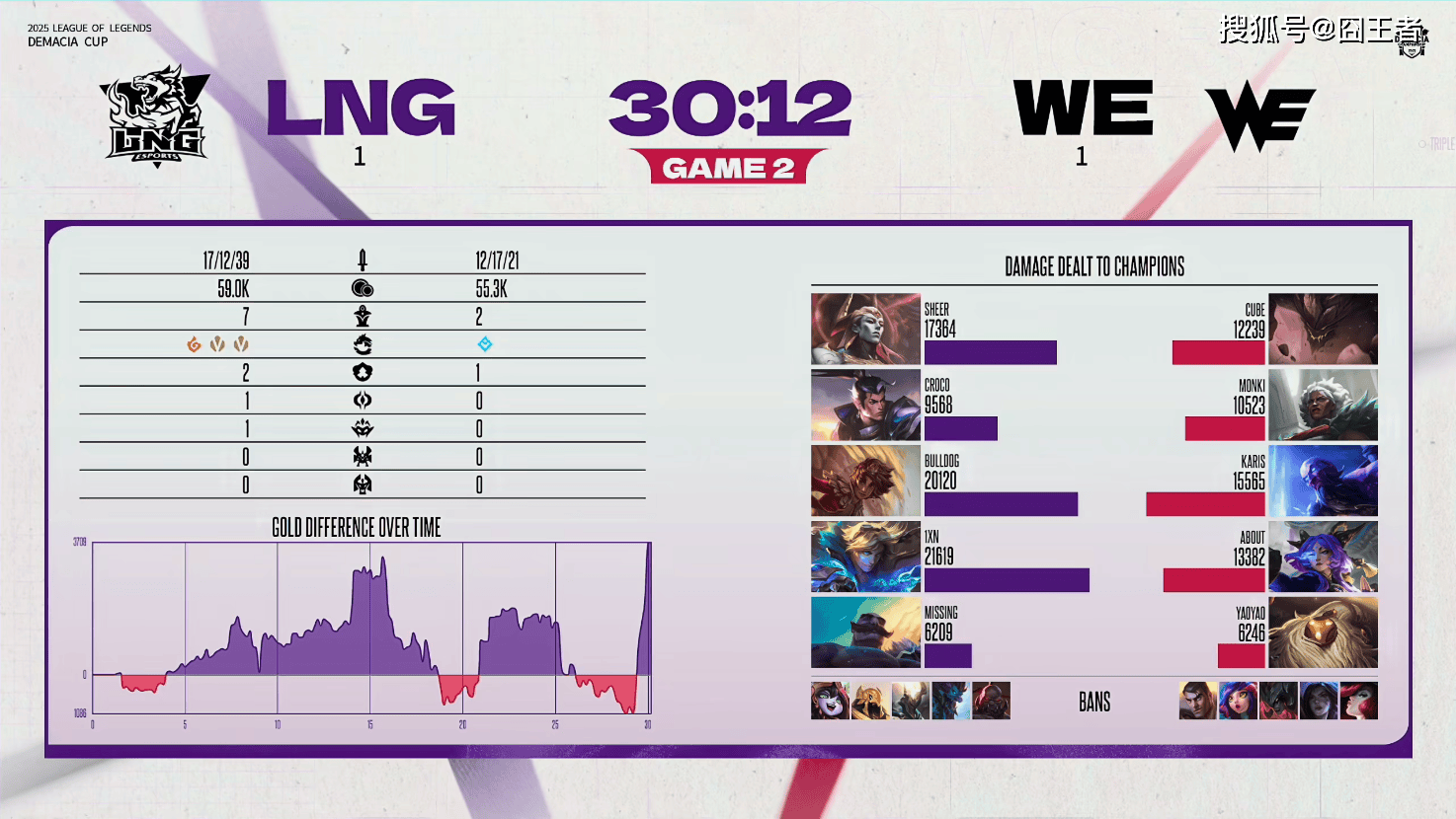 结果第二局比赛,两队打出了经典翻转,LNG笑到最后。比赛前期,LNG一度打出优势,比赛第16分钟左右,Monki安蓓萨三杀同时中路芸阿娜对位单杀,WE一波打出0换4抹平劣势;比赛第21分钟左右,LNG再度打出1换3,此后LNG逐渐扩大优势;最终比赛第30分12秒,LNG中路一波0换3后结束比赛。