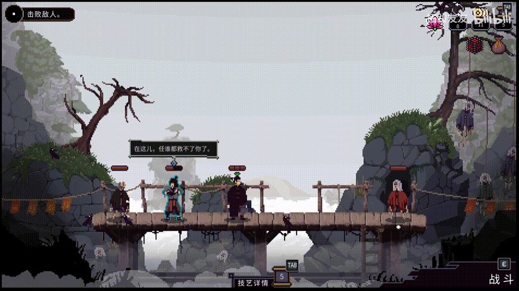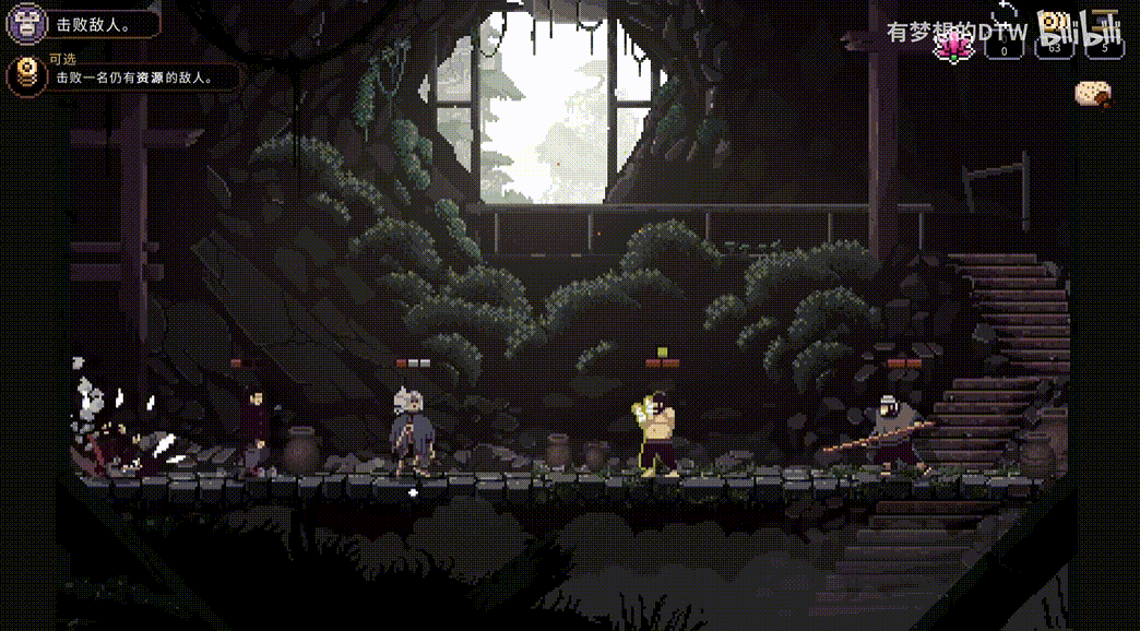 游戏中出场的敌人也是各个身怀绝技、难以硬拼,而主角仅仅3点的初始血量和稀少的回血道具则诱导着玩家“无伤过关”,尽全力磨练自己的技术。