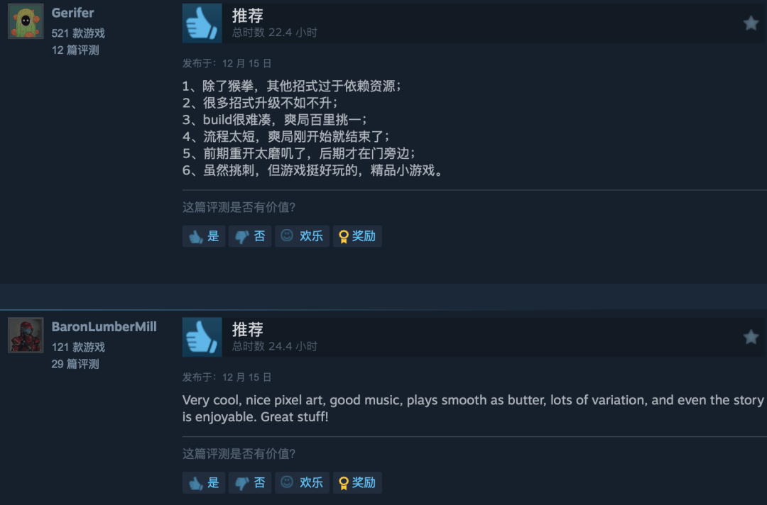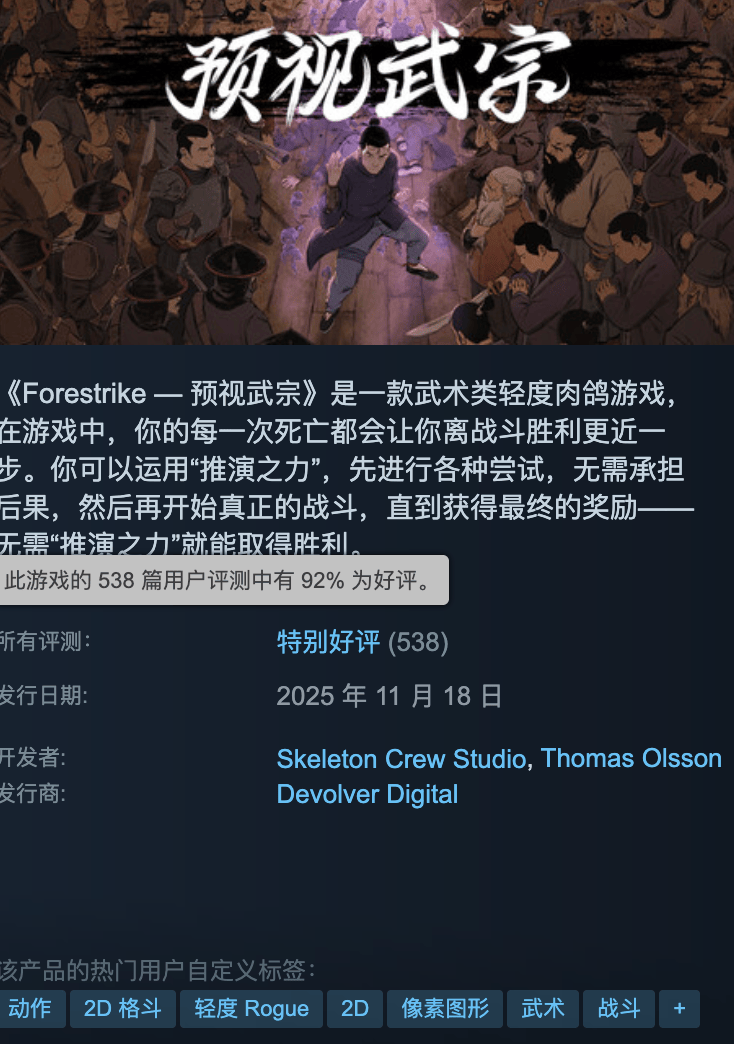 其实观察Steam上玩家给的评价,不难发现大家其实很少是因为《预视武宗》用了“中国功夫”这个包装而给好评。大部分人首先认同的是游戏本身是好玩的。