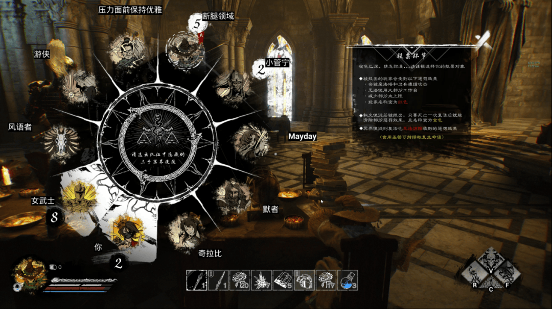这种“娱乐性为王”的理念也根植于《骤影绯月杀》的深处。从我看到的内部测试版本来看,绯月杀除了保留了狼人杀投票的经典玩法之外,还引入了一套职业和养成的RPG玩法。在第一阶段,玩家需要拔除三个瘟疫点,在此期间可以通过做任务或者打BOSS快速获得强力装备和魔法,而狼人角色既可以乘机捣乱,也可以静观其变。