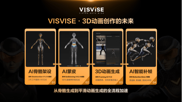 同时,演讲还介绍了VISVISE的3D动画生成功能,作为业界首个可投入生产的大规模3D动画生成模型,本次全新发布的 MotionGen Beta 模型,拥有1B+参数量,相较于上一个版本MotionGen Alpha,新模型实现了巨大的效果跃升:滑步、抖动、扭曲等异常现象的出现概率降低6倍,并能生成多样且极为细腻的动作效果,其质量已超越行业顶尖水平。该系统包含三大核心AI工具:多模态动作生成工具 FramingAI 、姿态生成工具 PosingAI,以及智能中间帧生成工具 MIB。这三款 AIGC 工具共同构成了端到端的智能动画生产解决方案,大幅提升了手工制作效率。