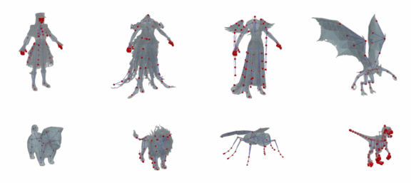 智能骨骼生成:该模块通过智能分析模型结构,能够高效生成适配的骨骼系统。其技术具有极强的泛化能力,不仅支持人形角色,更涵盖四足生物、枪械武器、怪物等各类资产。针对复杂的人形角色,系统还能一键生成主骨骼及飘带、裙摆等自适应辅助骨骼,将传统需数日的手工工作压缩至分钟级。