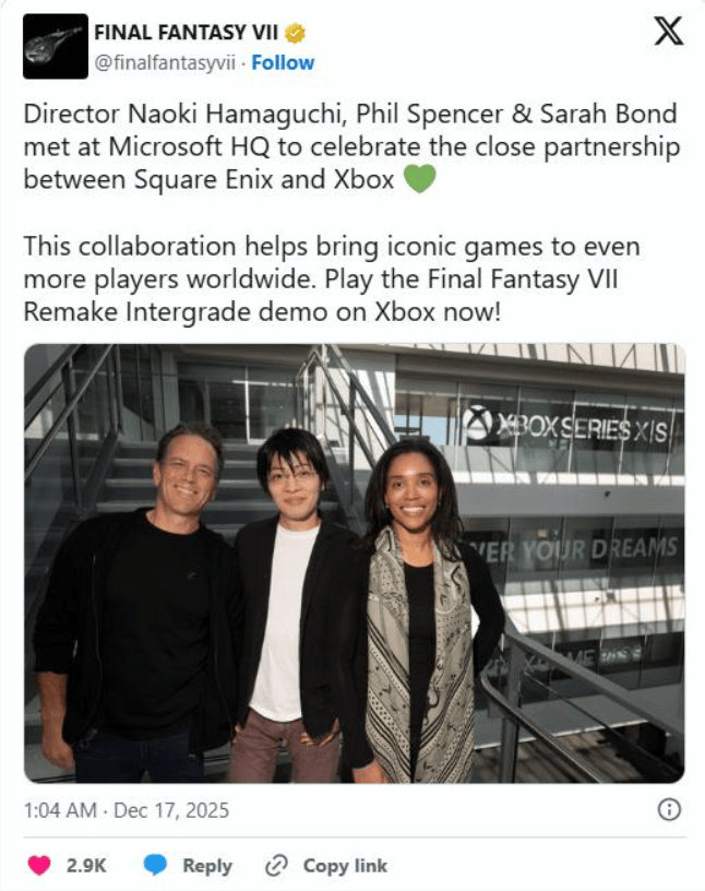 曾经有一段时间,Square Enix 与微软Xbox的关系仿佛降到了冰点,甚至让不少软粉觉得SE已经成了PlayStation的第一方工作室。然而,这种局面在2025年的尾声被彻底打破。随着《最终幻想7:重制过渡版》的Xbox体验版于本周正式上线,SE官方账号高调晒出了一张意味深长的合影:游戏总监滨口直树亲临微软总部,与Xbox负责人菲尔·斯宾塞(Phil Spencer)及莎拉·邦德(Sarah Bond)并在著名的Xbox Logo下谈笑风生。