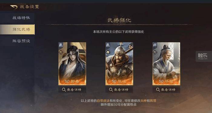 每场战斗的强化武将都是随机的,这也考验着玩家的配将水准
