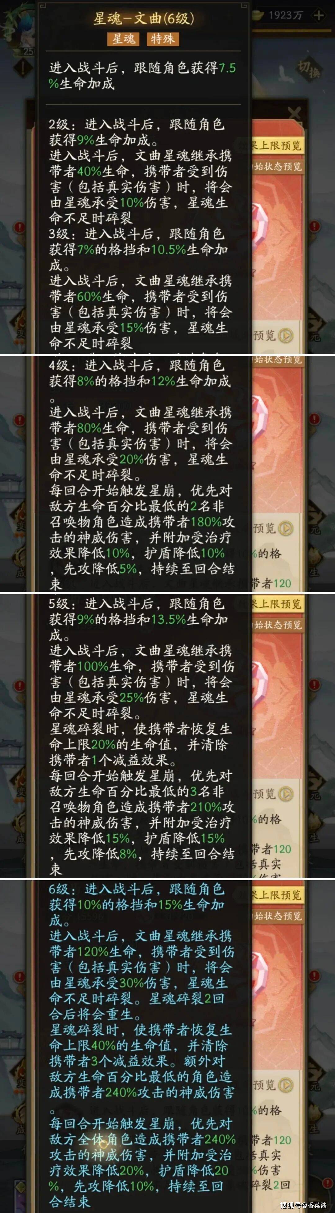 2、进入战斗后,文曲继承携带者120%生命,携带者受到伤害时(包括真伤),将会由星魂承受30%伤害,星魂生命不足时破裂,破裂2回合后将会重生。