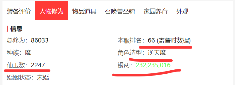 目前看到最高的是这个逆天魔的角色,号主摆价3.8W,1转115级成品号,本服排名66,总修为8.6万,号上银两2.3亿,2000+仙玉,有五件仙器,三件神兵,性价比明显没有1.3W龙渊客这个角色高。
