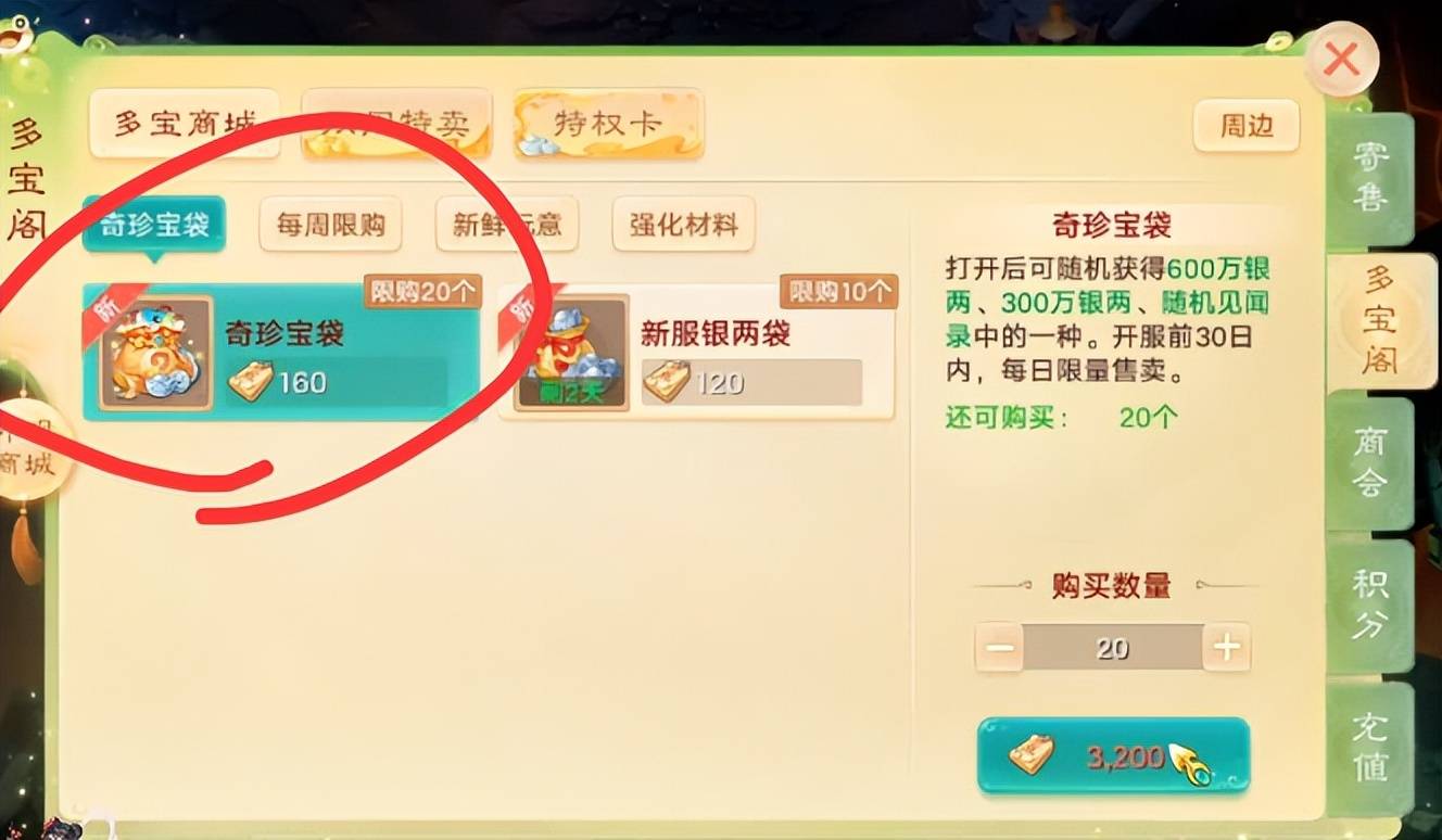 奇珍宝袋包含600万银两、300万银两、随机见闻录中的一种,每次开启保底300万银两,每天限购20个,像本周12月16日上线的【大圣娶亲】,第三批自由交易服,你还可以购买新服银两袋,配合特权卡使用可实现稳定收益。
