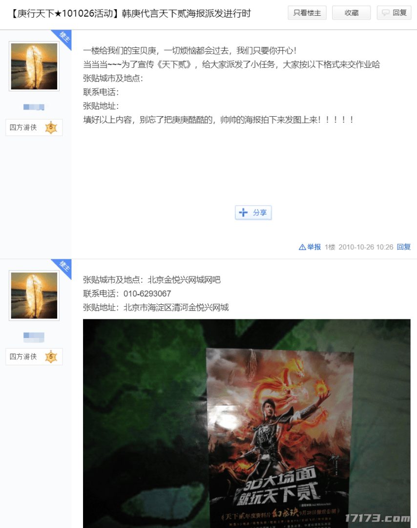 要知道在当时,为了支持韩庚与帮他出气的《天下贰》,全国各地的“庚粉”们可不仅是连夜下载了游戏,还发起了一场名为“庚行天下”的线下应援活动,跑到本地的网吧自发当起“地推”,给网吧老板塞钱搞活动、挂韩庚代言的海报。