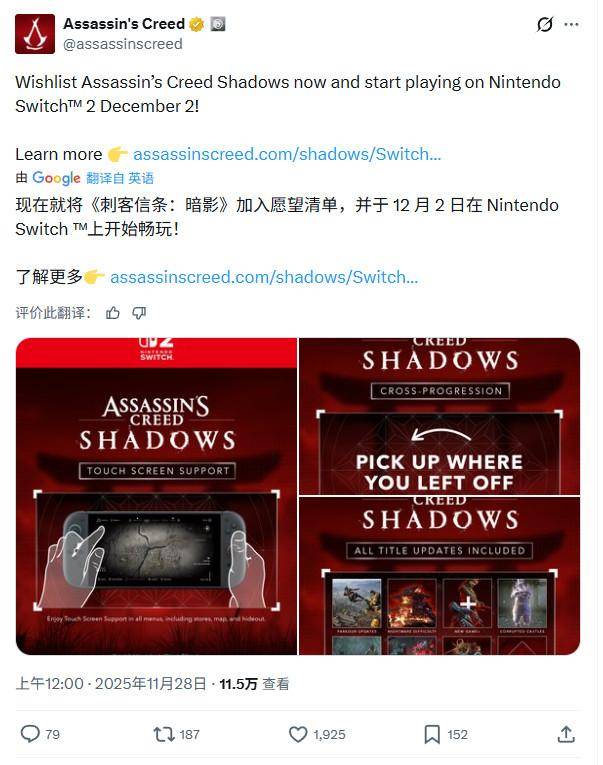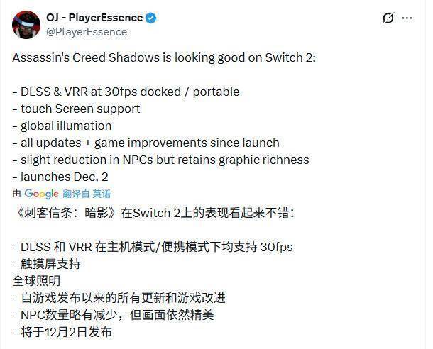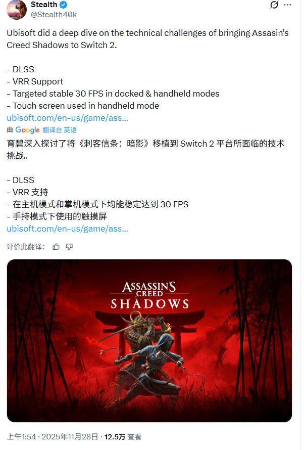 11月28日,育碧在其官网上发布了《刺客信条:影》Switch 2版幕后开发消息,详细介绍了移植背后的技术创新。《刺客信条:影》Switch 2版即将于12月2日发售。