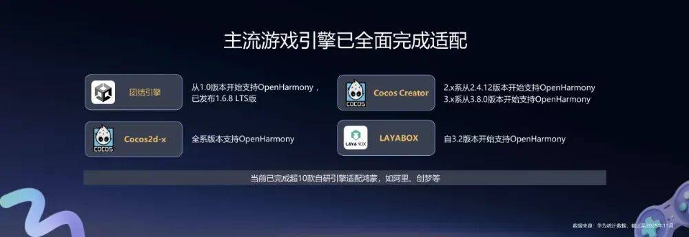 Cocos、团结引擎、LayaBox等主流游戏引擎,以及FMOD、Wwise等常用的第三方SDK都已完成HarmonyOS或者OpenHarmony适配。这意味着开发者不需要从零开始,他们熟悉的工作流和工具链基本上可以平移过来。