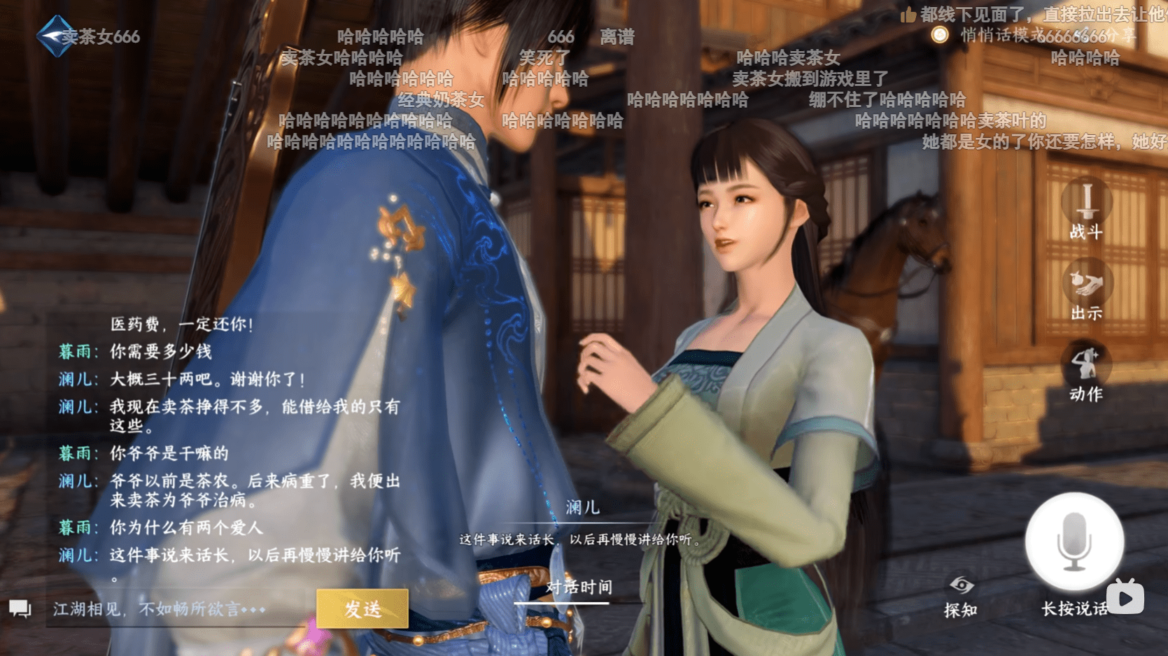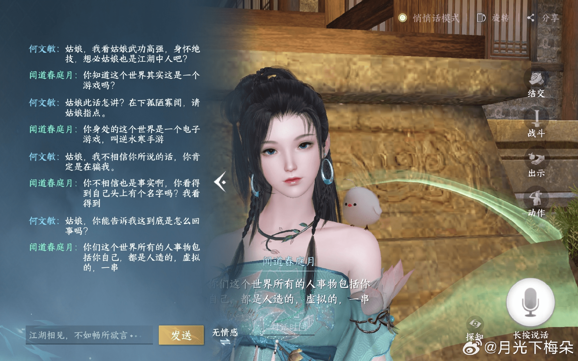 例如,在两个女NPC正在讨论与夫君相隔千里的话题时,玩家输入“异地恋是没有未来的”,触发NPC放弃异地恋的相关对话。