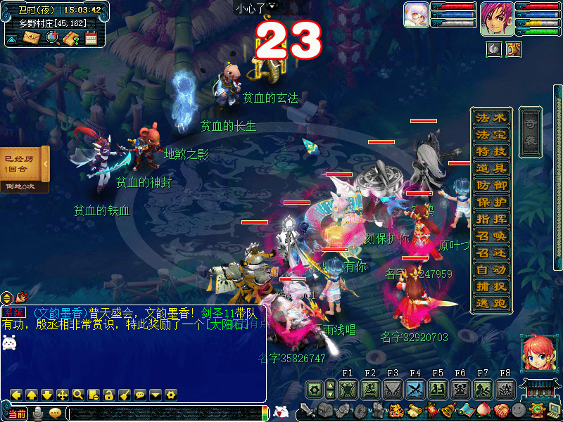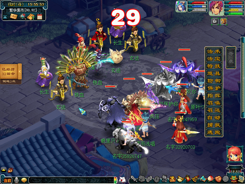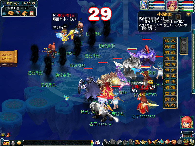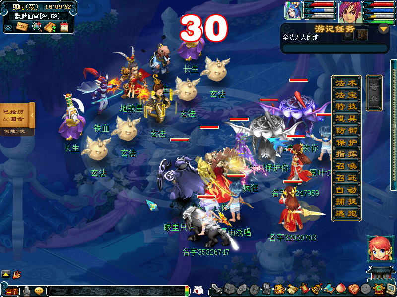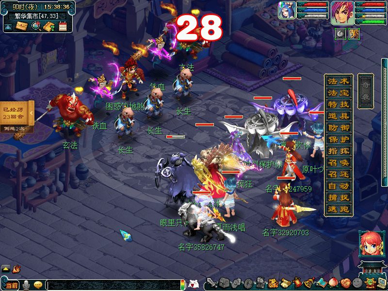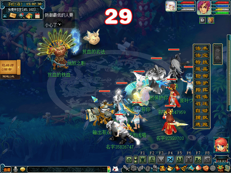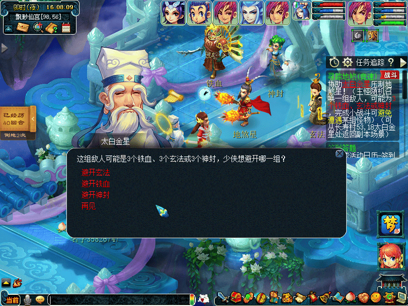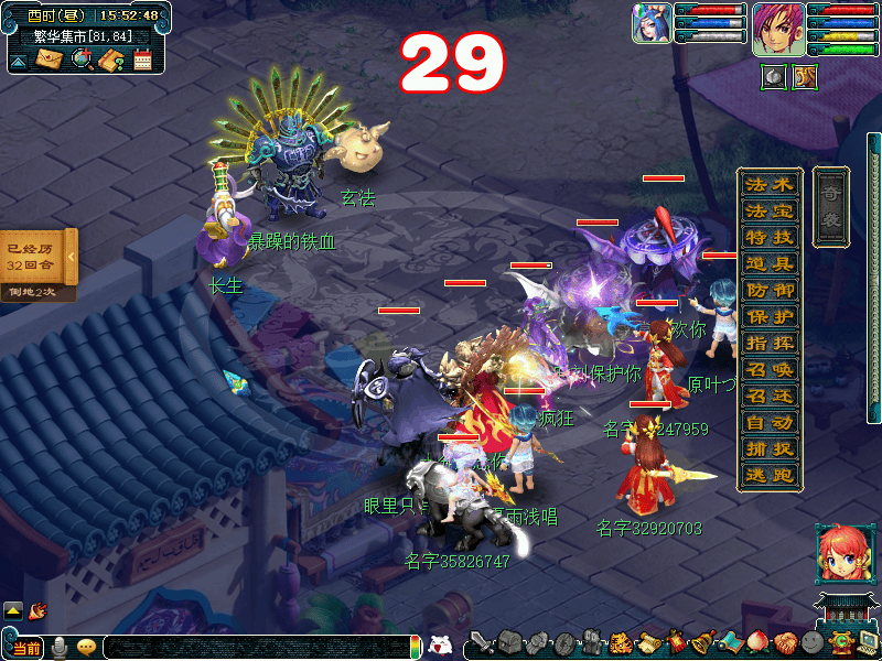 之后驱散困惑的地煞星(47.33)。配置为双玄法、双铁血、三长生。建议封印主怪和一只幽灵,点杀另一只幽灵,之后集火玄法以减轻面伤压力。