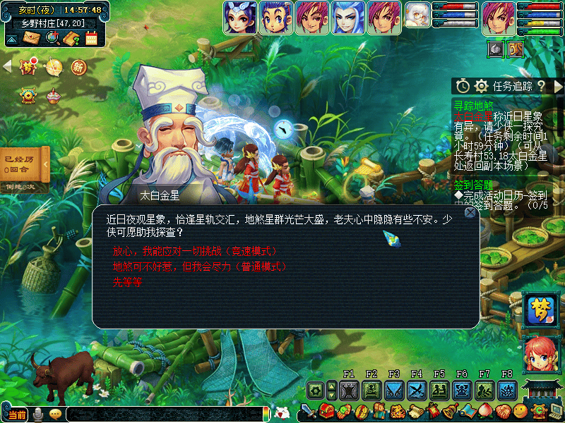 进入副本后,传送至乡野村庄场景,找到太白金星(53.18)选择副本模式。本次笔者为求收益最大化选择了竞速模式,建议实力稍弱的小伙伴选择普通模式。