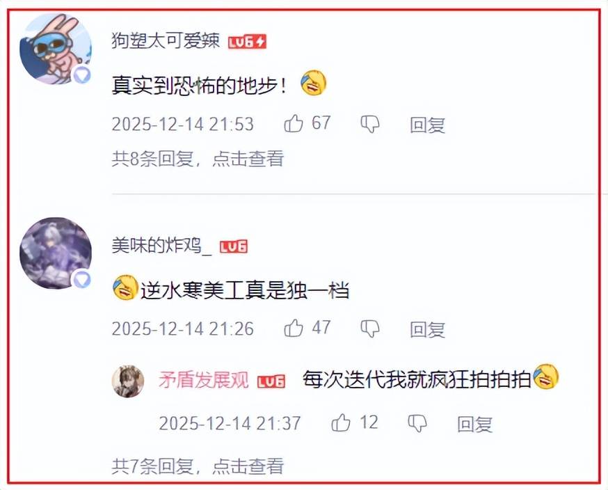 当看到官方晒出跨年版本的画质大提升,大家都感受到明暗精雕的角色轮廓,还有水润真实的肌肤质感,不少玩家感叹“真实到恐怖的地步!”、“逆水寒美工真是独一档”……